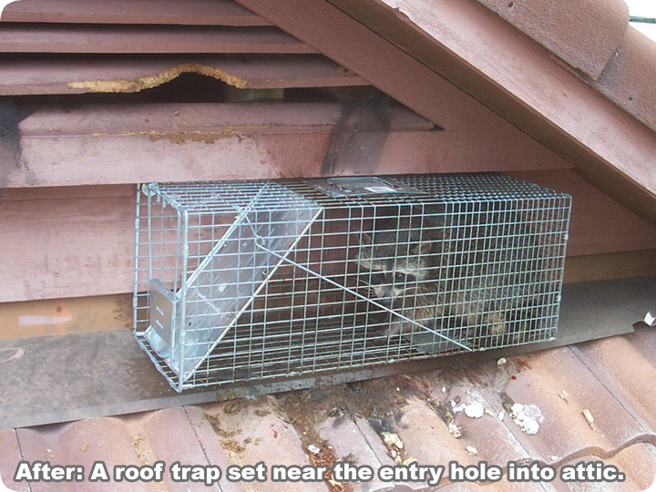 This is a series of photos of trap sets in the field. These examples are meant to show how professional trap setting looks. The reality is that every case of raccoon trapping is different: number of raccoons, location, type of architecture of the roof or attic they are in, etc. I've done over 1000 raccoon trapping jobs, and every set has been different. There are so many little variables that mean the difference between success and big problems! Trapping is not for amateurs.
