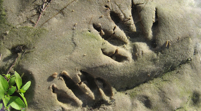 The raccoon tracks will be slightly asymmetrical, showing small and sharp claws. Behind the palm pad, you will sometimes be able to see the heel pad on the outside of the leg. The hind tracks will be larger than the front tracks.