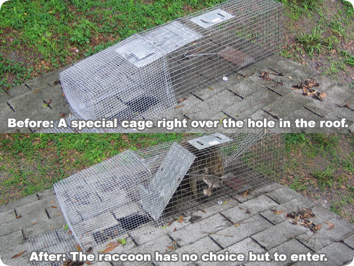 In the above photos, you can see that that a raccoon has torn a hole right through the shingles and into the roof! I've seen this plenty of times. After confirming that the raccoon was inside, I set this special trapping system that forced the raccoon